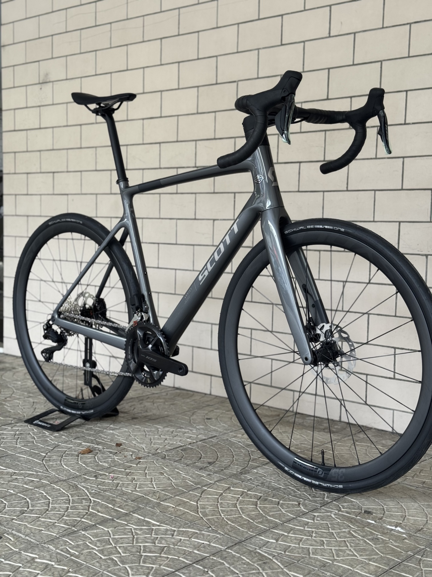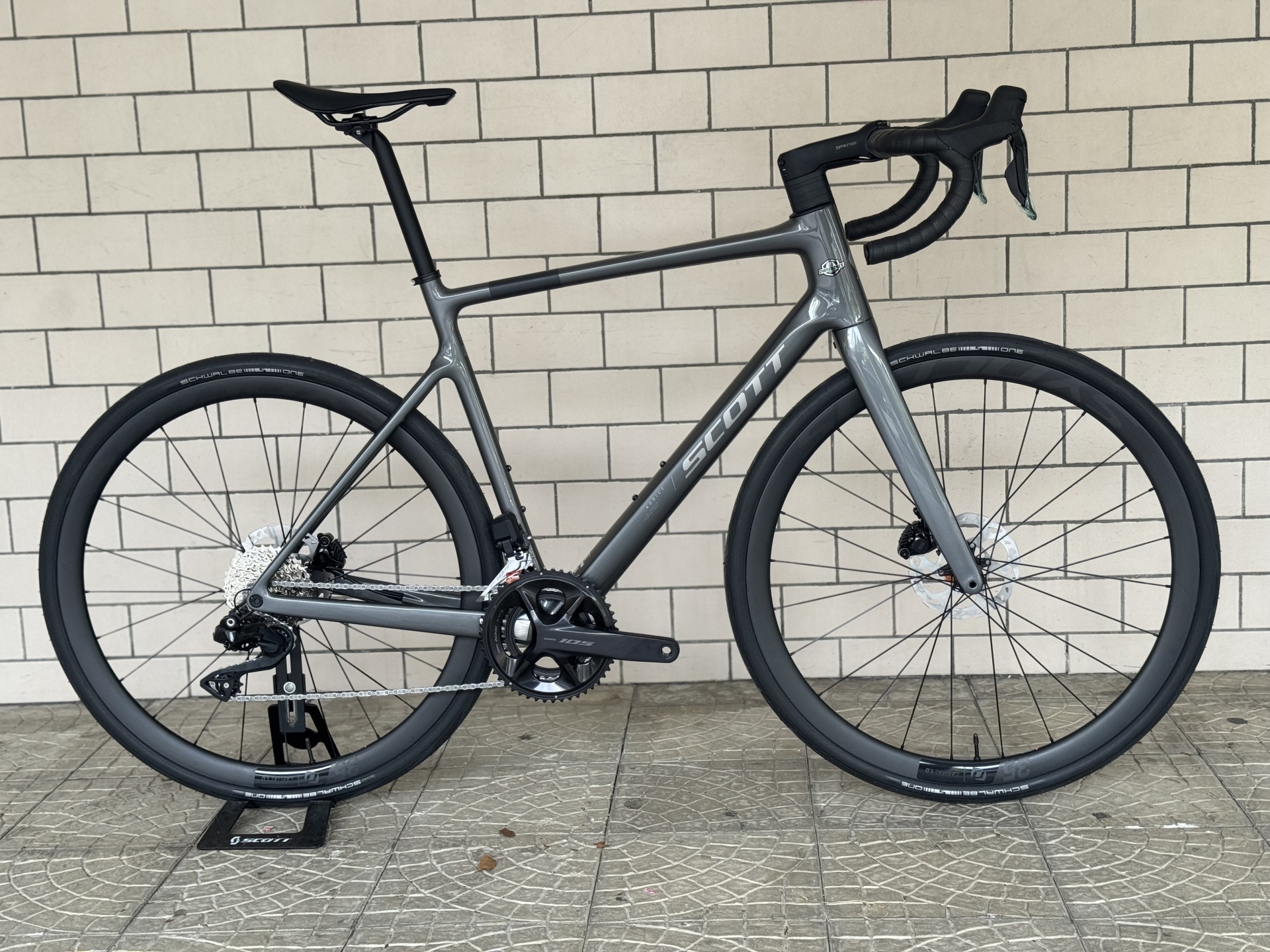 Bicicleta de estrada cinza SCOTT com pneus Schwalbe ONE encostada a parede de azulejos